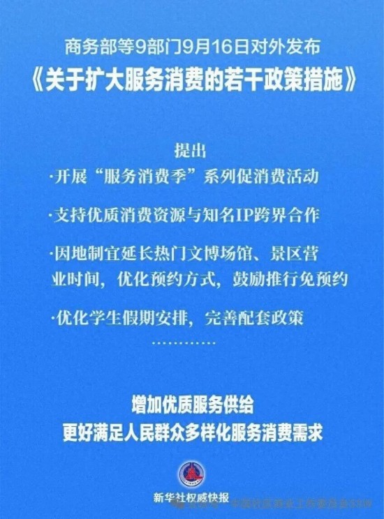 9月16日,在求是杂志总书记部署了《纵深推进全国统一大市场建设》工作,新商业的发展方向和答案是明确的。9月18日,商务部等九部门发布《关于扩大服务消费的若干政策措施》提出五方面19条举措进一步扩大服务消费。将在50个城市,开展消费新业态、新模式、新场景试点建设。